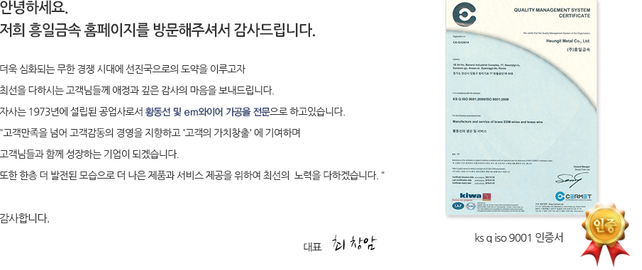 • 상호명 (주)흥일금속 | 대표자 최창암 | 사업자등록번호 134-81-01280 | TEL 안산공장:031-494-2637, 031-494-4770 화성공장:070-4241-2637, 031-357-9637